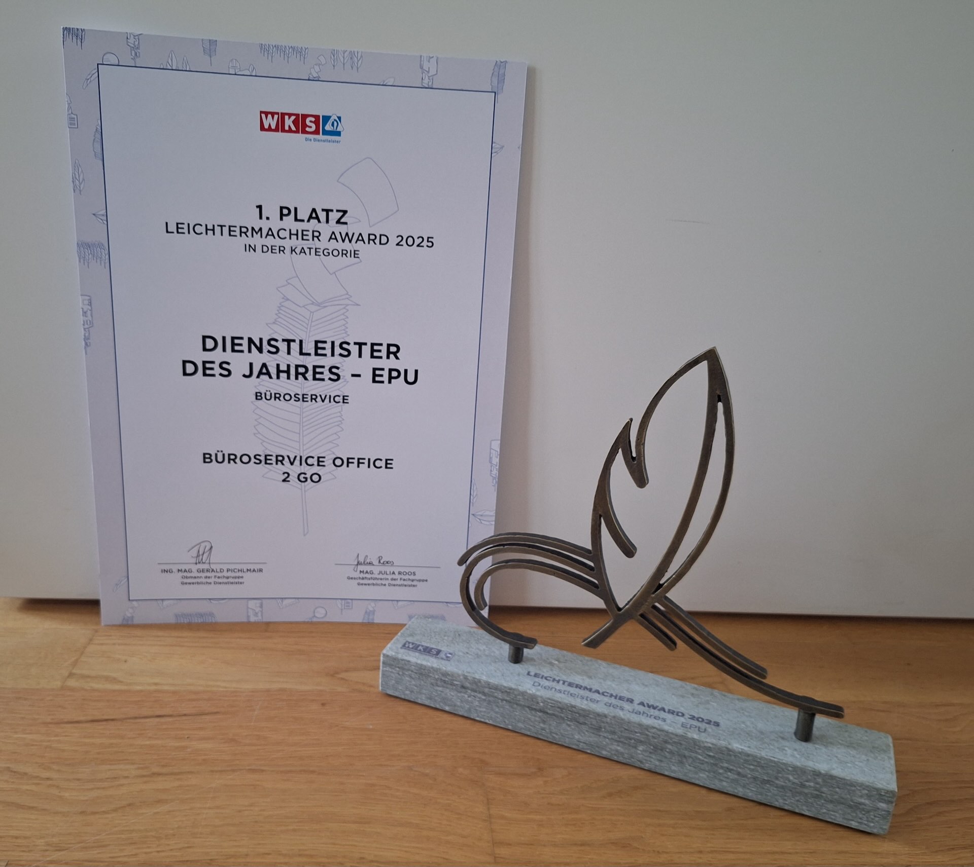 Doch damit nicht genug: Auch 2025 war mein office-2-go wieder mit dabei und erreichte erneut den 1. Platz; diesmal in der Kategorie „Dienstleister des Jahres – EPU – Büroservice“.